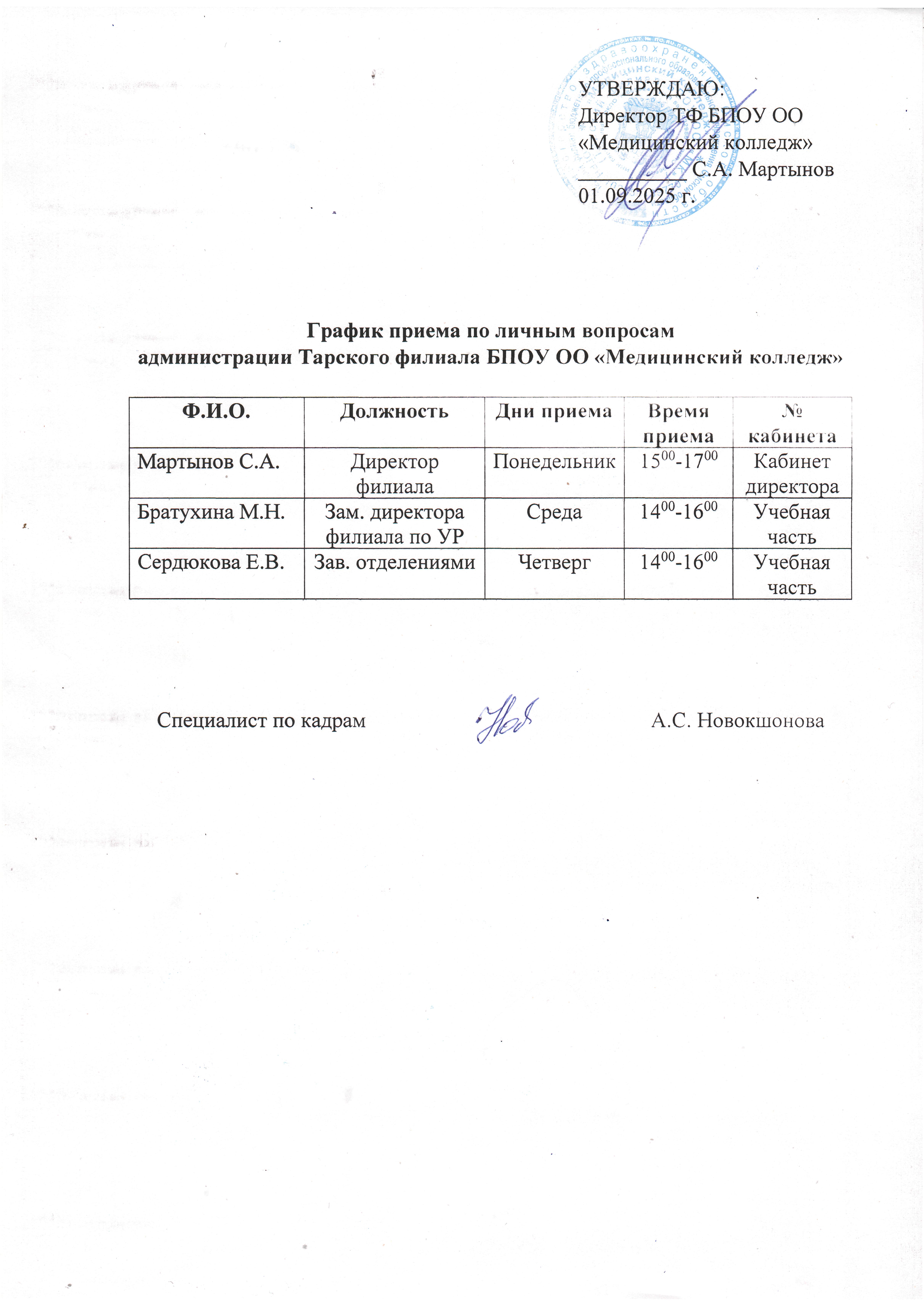 Администрация Тарского филиала БПОУ ОО «Медицинский колледж»